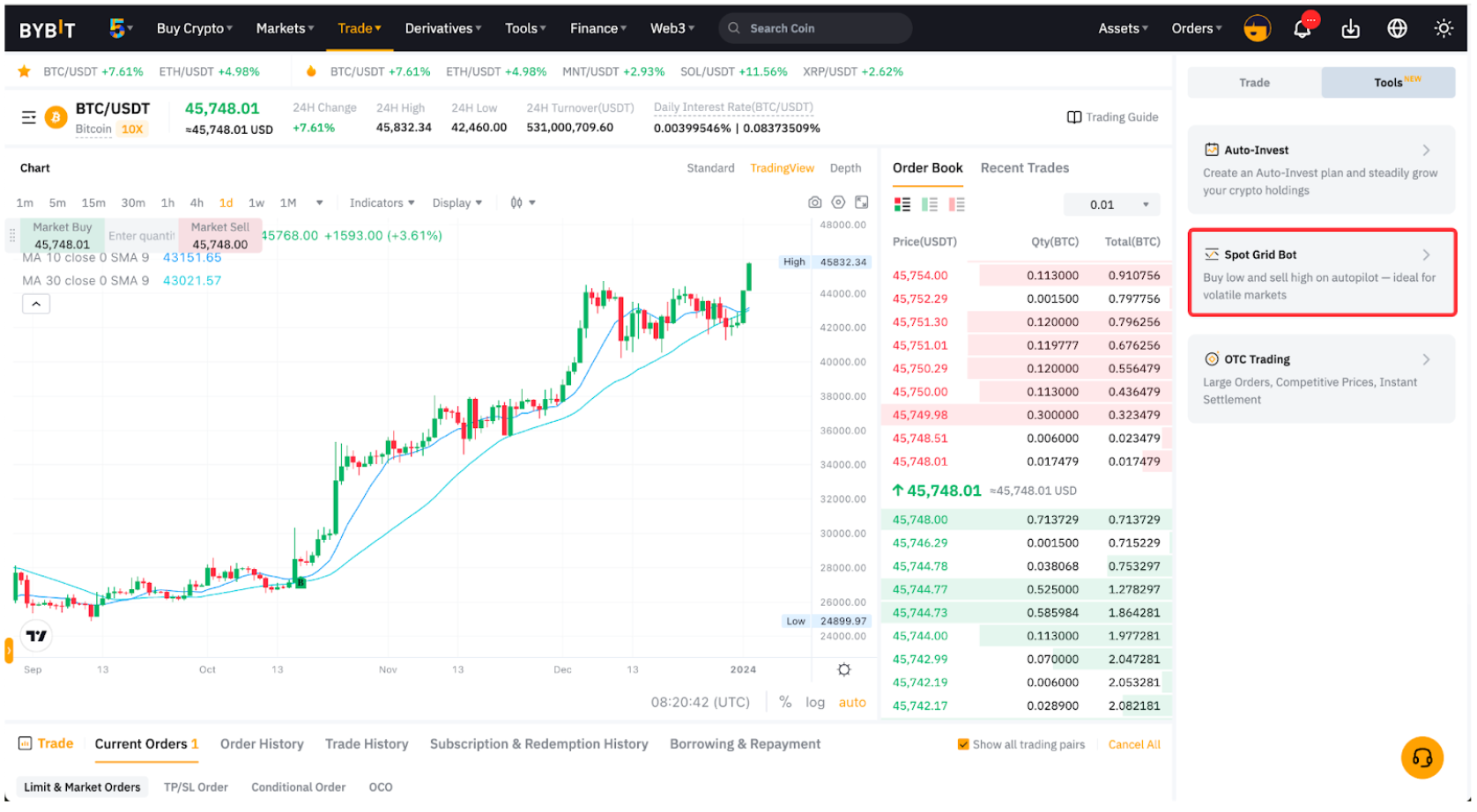 または、現物取引のページで、右側の注文ゾーンに移動し、「ツール」→「現物取引ボット」を選択します。