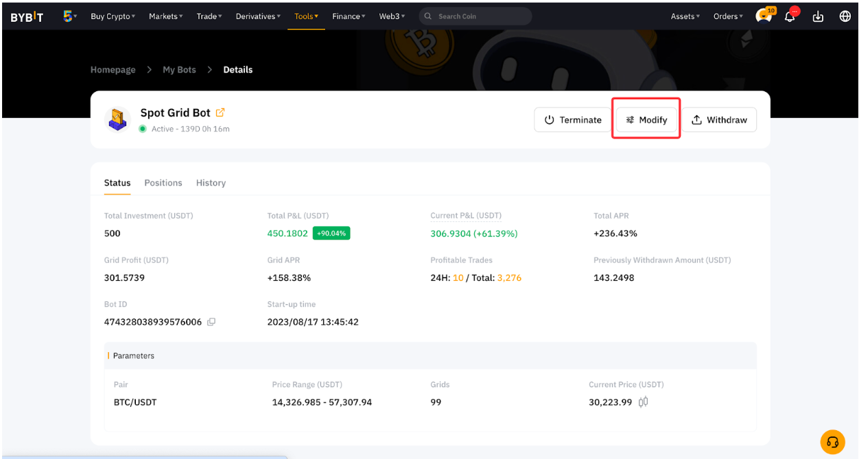 ステップ1:現物取引ボットの詳細ページに移動し、「Modify(修正)」をクリックします。