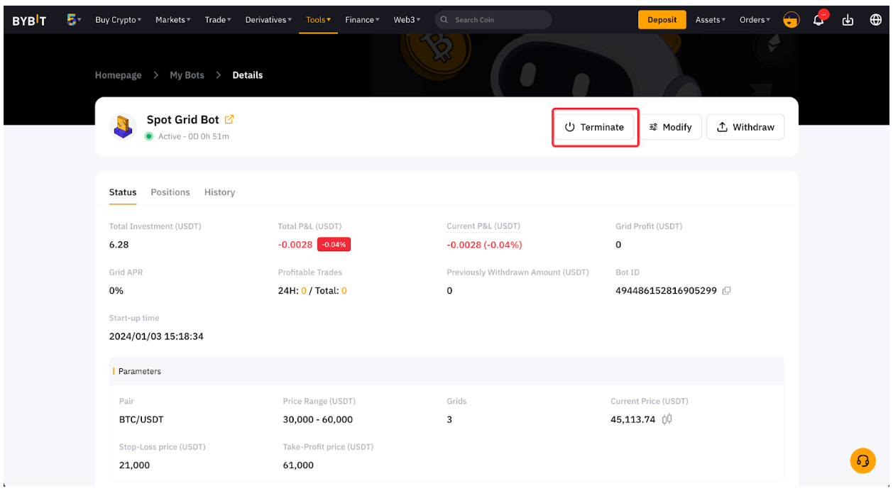 現物取引ボットを停止するには、現物取引ボットの詳細ページに移動し、「停止」をクリックします。