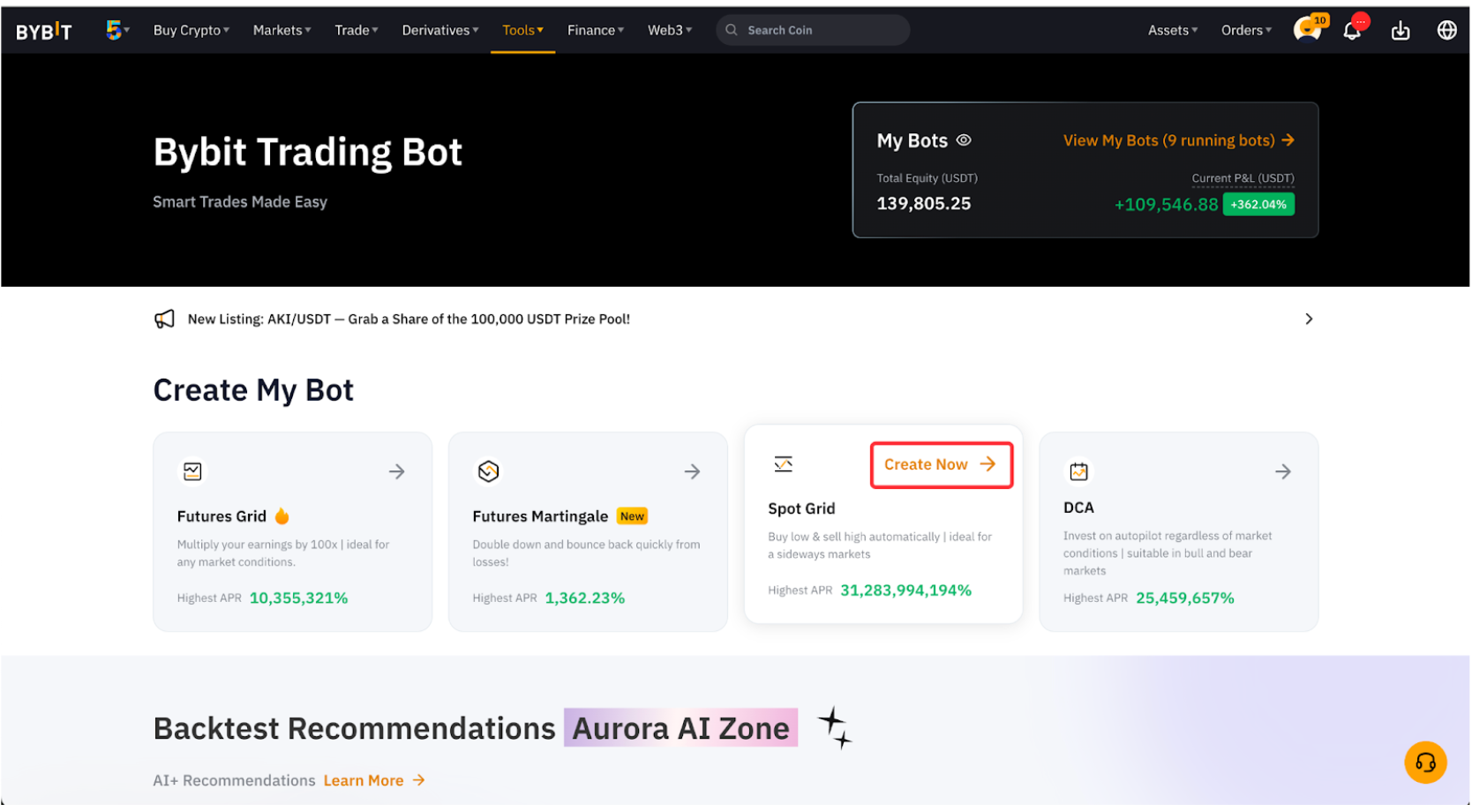 ステップ1:ナビゲーションバーで「現物」→「取引ボット」をクリックし、「Bybit取引ボット」のページに移動します。
