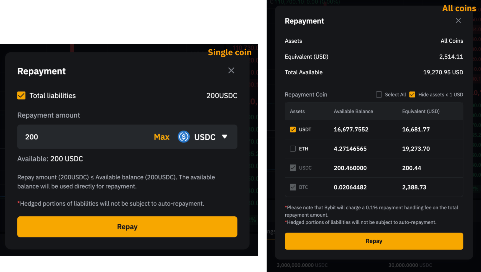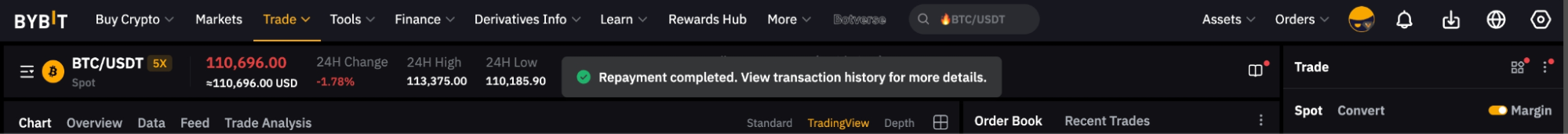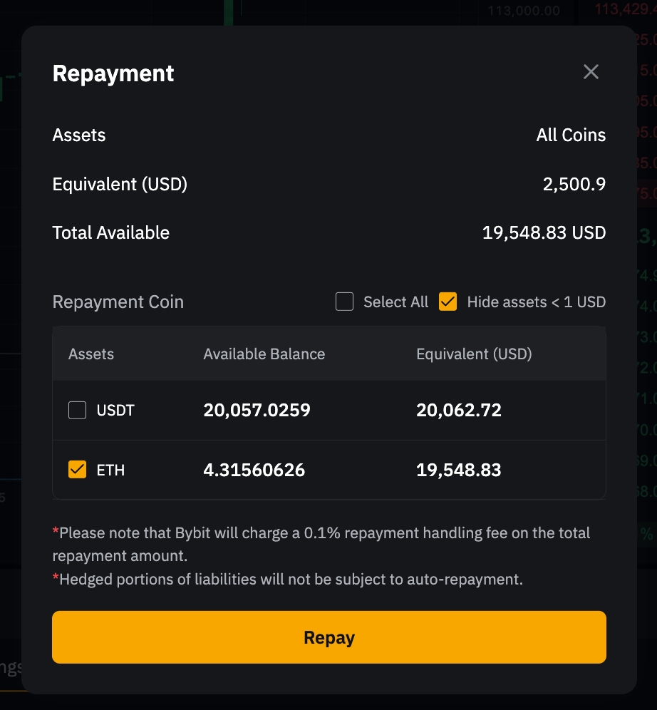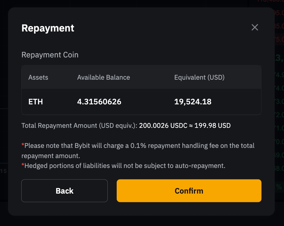 確認後、システムはまず返済のために利用可能な借入コインを使用します。残余債務は、担保資産を借入通貨に転換することで返済されます。返済にあたり換算が必要な場合、Bybitは返済総額に対して0.1%の手数料を請求します。