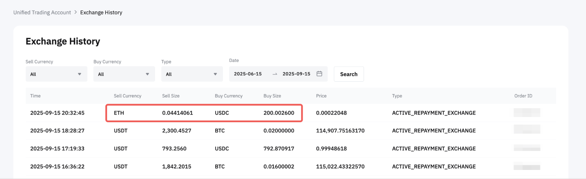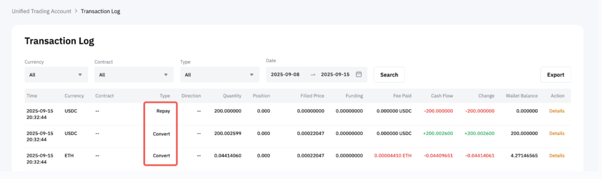 トランザクションログでは、変換および返済のトランザクションタイプで、各返済の詳細が表示されます。同じタイムスタンプと注文IDが順次表示されます。