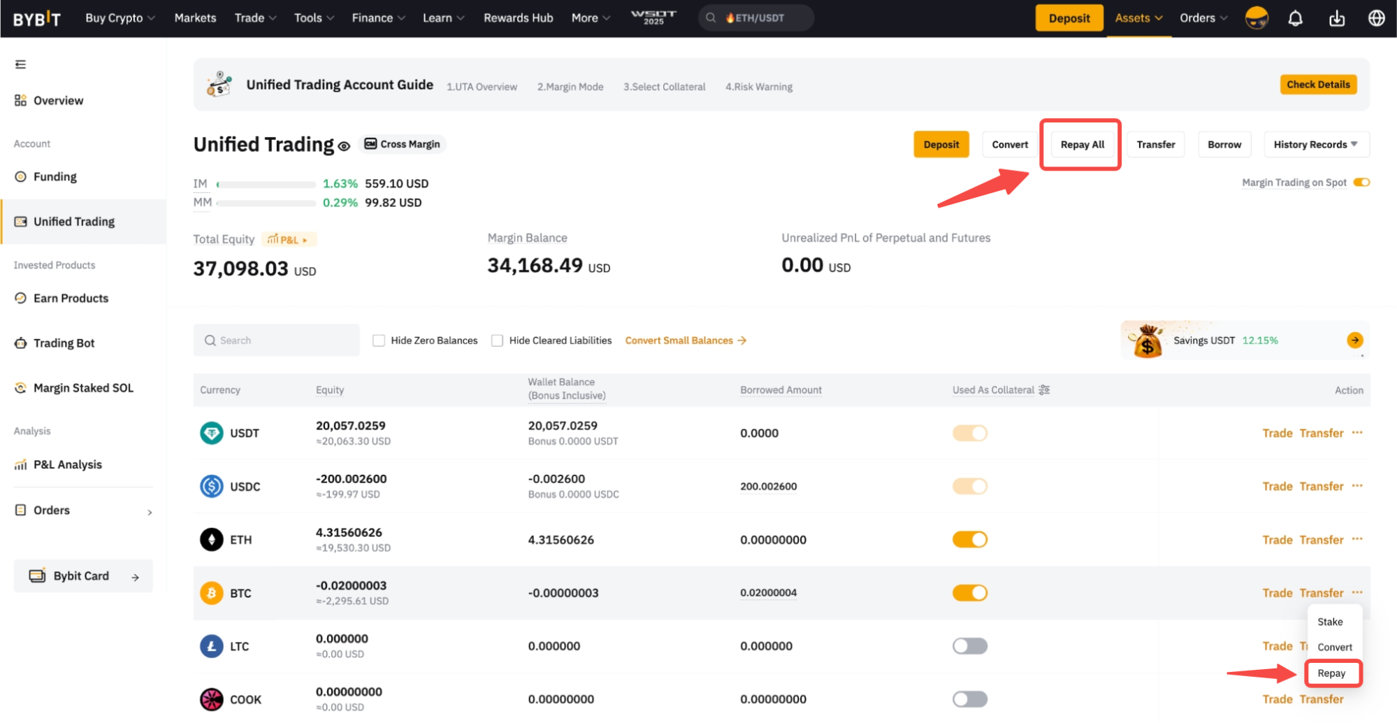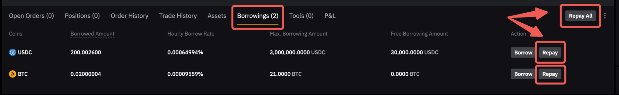 借りたすべてのコインを返済する場合は、Unified Tradingページ上部にある Repay All をクリックしてください。