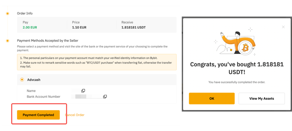 ステップ4: Bybit P2P注文ページに戻り、支払いが完了したら、支払い完了をクリックします。広告主がコインの送金を処理するのを辛抱強く待ちます。購入したコインが売り手によって資金口座に正常にリリースされたら、自分の資産を表示をクリックして、取引履歴とともに確認することができます。