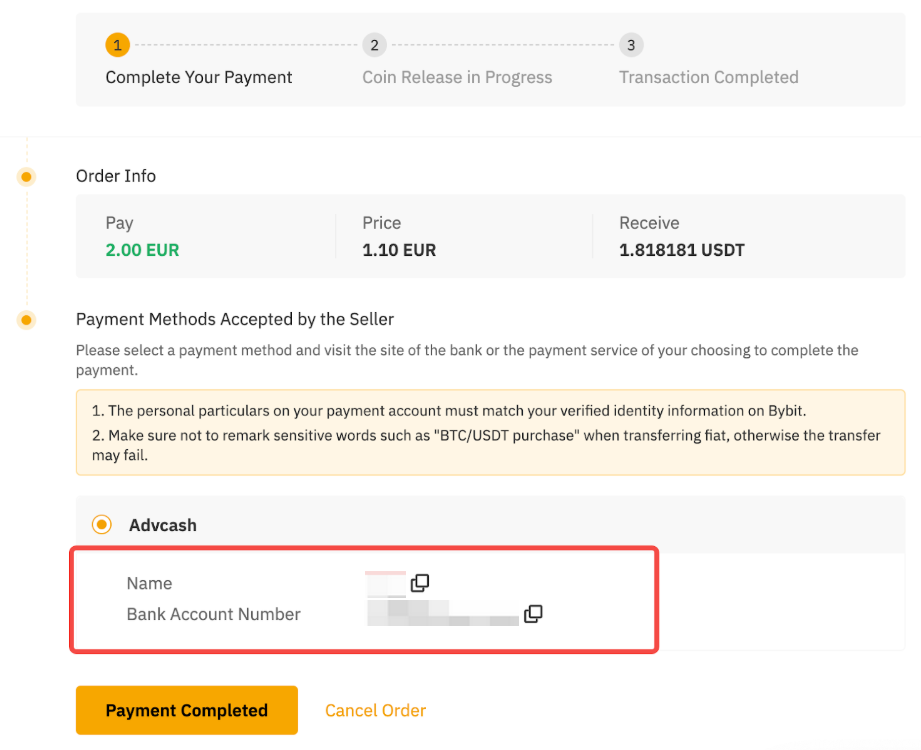 —銀行口座の名前は、Bybitに登録されている名前と一致している必要があります。そうでない場合、広告主は注文をキャンセルし、返金を発行することができます。