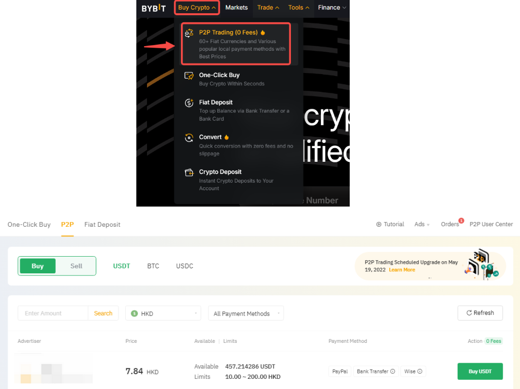 ステップ1:ナビゲーションバーの左上隅にある暗号化の購入 → P2P取引をクリックしてP2P取引ページに進んでください。USDTを購入したい場合は、ご希望の広告を選択し、USDTを購入をクリックします。