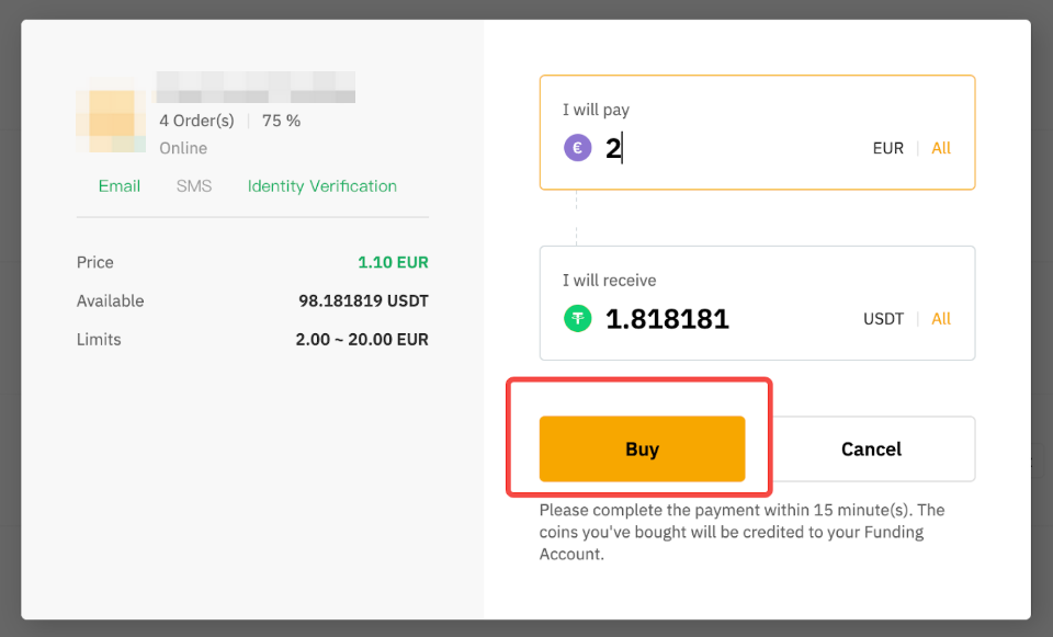 注文ページにリダイレクトされます。ここで、指定された時間内にお客様のフィアット資金を売り手の銀行口座へ振り込む必要があります。先に進む前に、ご注文の詳細がすべて正しいことを必ずご確認ください。