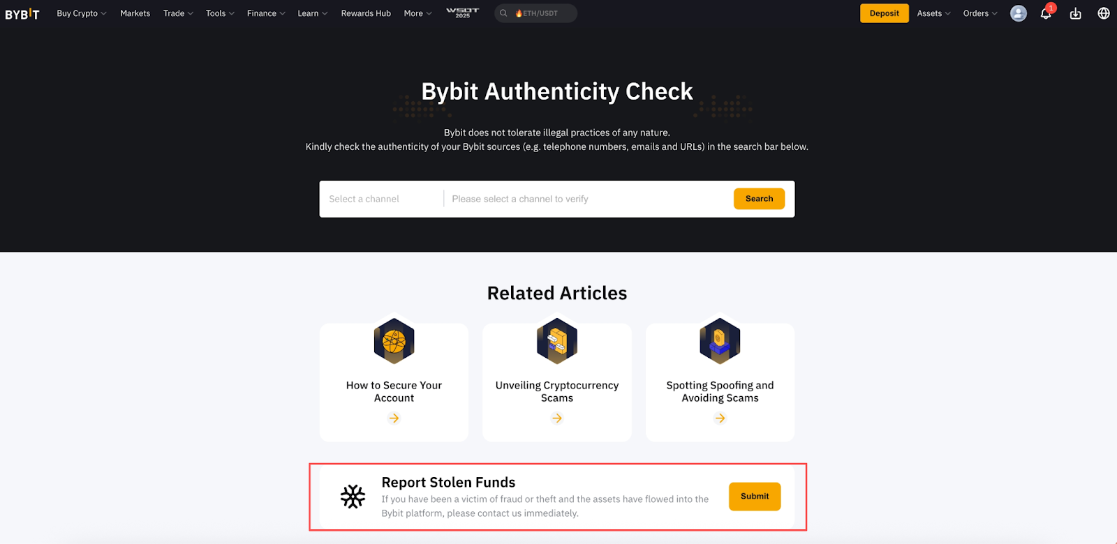 「Bybit公式チャンネル認証」ページにアクセスし、「盗難資金の報告」欄の「提出」をクリックしてください。