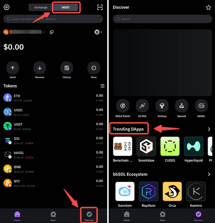 a) Bybitアプリを開き、ウォレットページに移動して「探す」 → 「Trending dApp」をタップします。