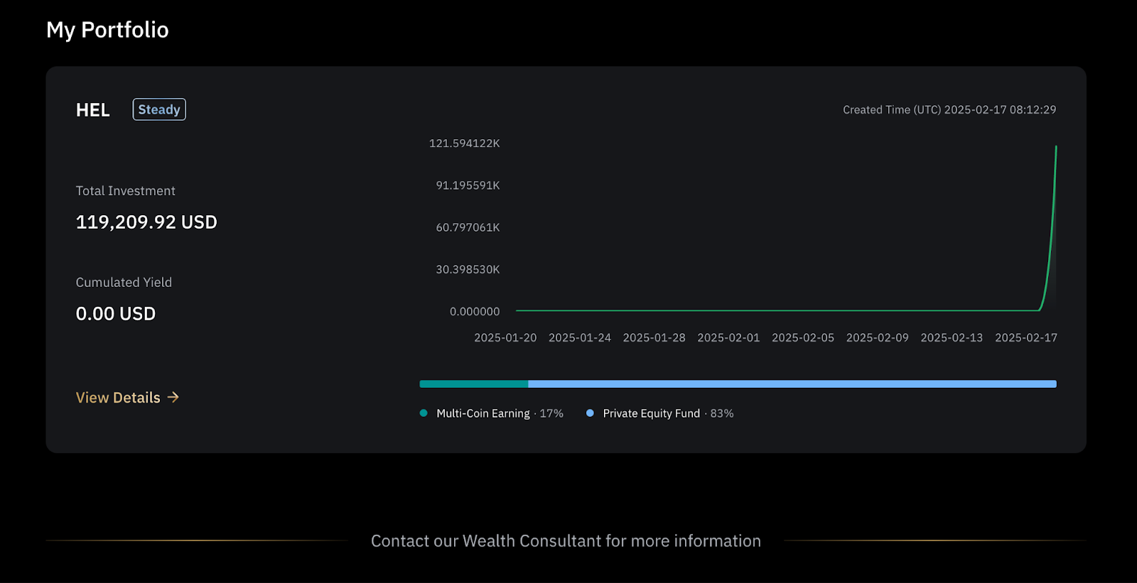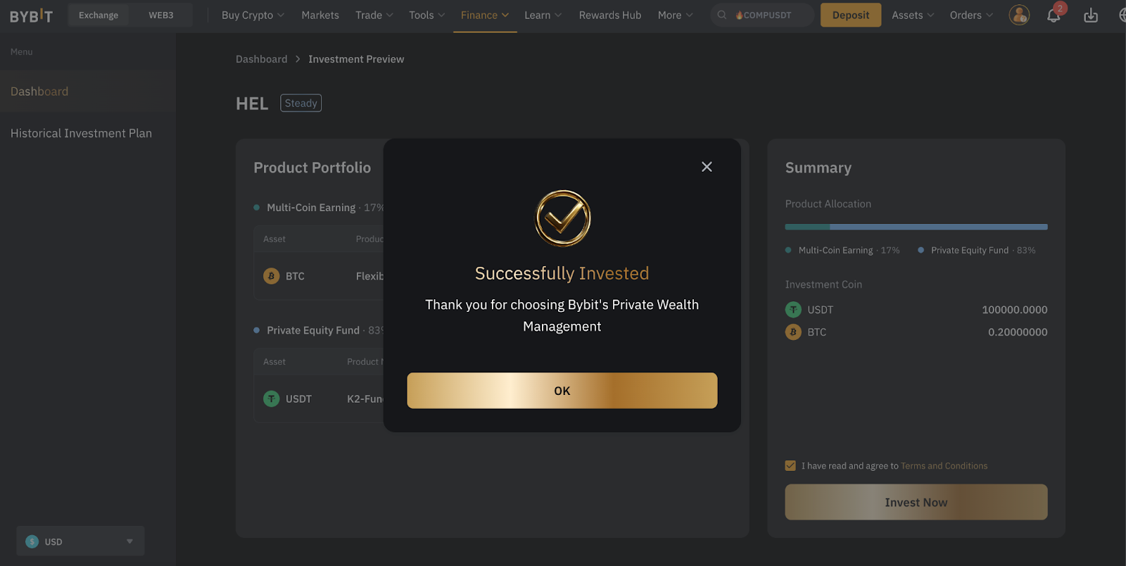 Bybitプライベート資産管理ページから資産コンサルタントにご連絡ください。お客様専任のコンサルタントが、お客様の財務目標、投資に関するご希望、リスク許容度を評価し、最適な投資戦略をご提案します。お客様からいただいた情報は社内で審査し、必要な基準を満たしている場合は、こちらからご連絡させていただきます。