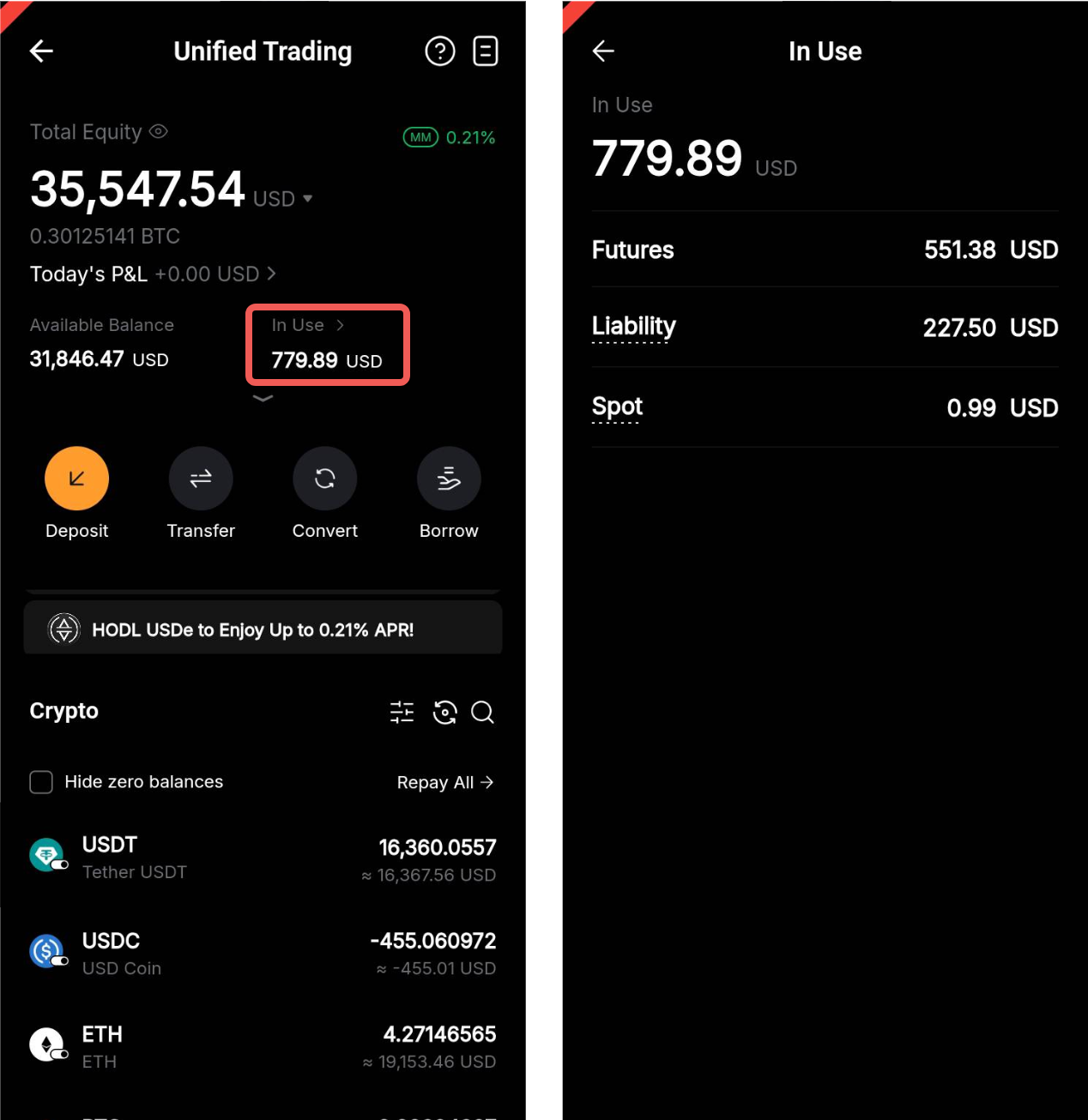 クロスマージン / ポートフォリオマージンモード:証拠金残高によって、アカウントリスクの維持や新規注文に使用できる金額が決まります。Bybitアプリでは、新たに「アカウント使用中」を確認できるようになりました。この項目は、お客様の証拠金残高のうち、現在、必要証拠金として確保されている部分を示します。