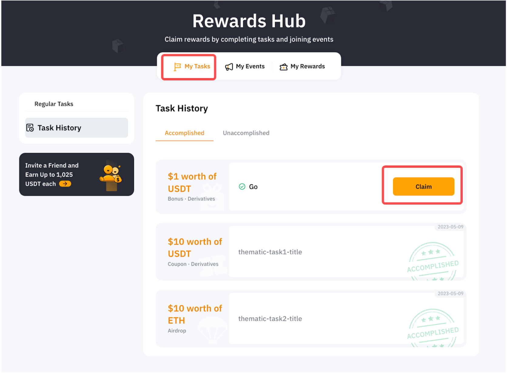 ステップ2:「マイタスク」をクリックし、「タスク履歴」を選択すると、「達成」セクションでボーナスを受け取ることができます。