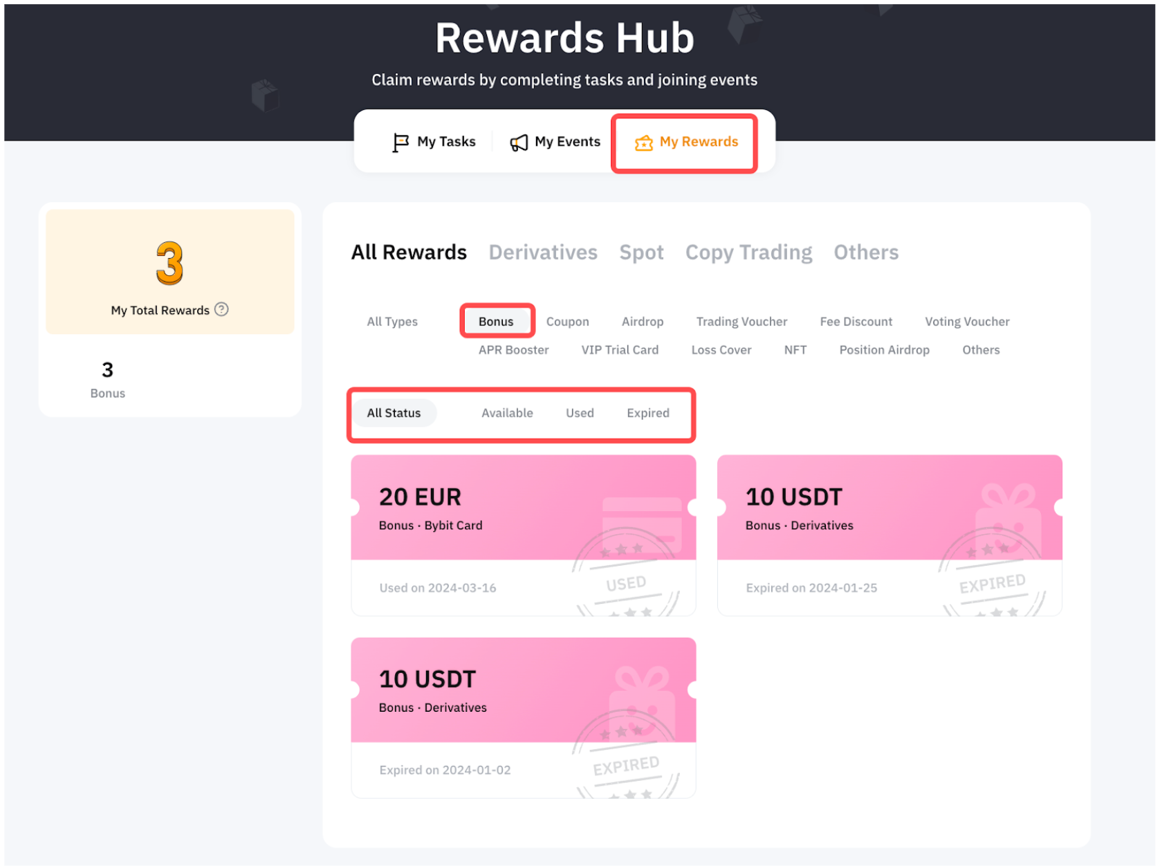 ステップ3: 受け取った特典の詳細を確認するには、「マイ特典」に移動し、「ボーナス」を選択して、受け取ったすべてのボーナスを確認します。