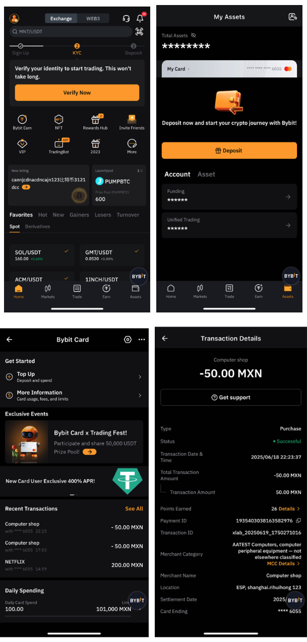 Step 1: Log in to your Bybit app → Assets→ My Card→ scroll down to Recent Transactions →  Transaction details, then tap on Get Support.