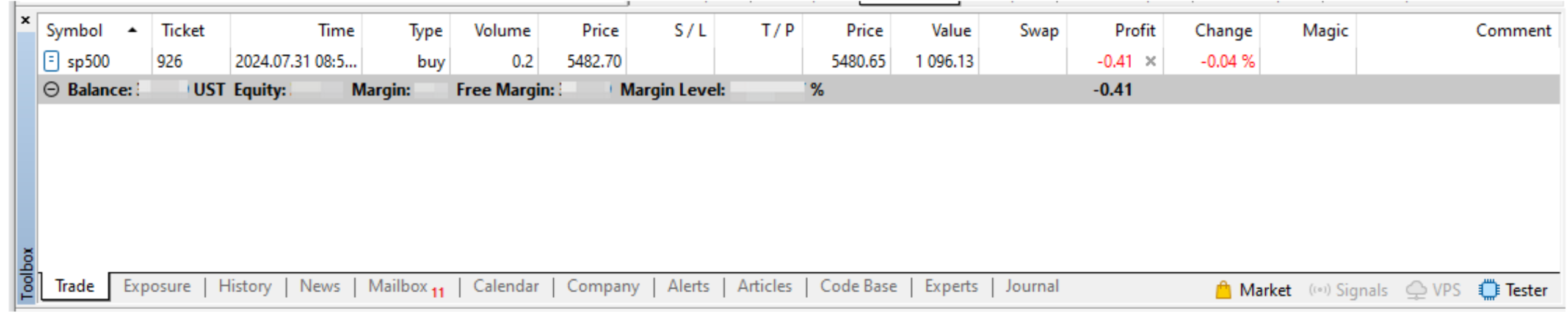 手数料はポジションの参入時に直接請求され、MT5アカウント残高から直接差し引かれます。MT4とは異なり、手数料欄はMT5ターミナルの取引タブには表示されなくなりましたが、履歴タブにのみ表示されます。