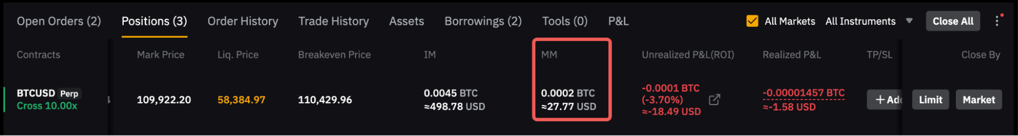 ポジションに必要なMM(維持証拠金)はポジションタブにあります。