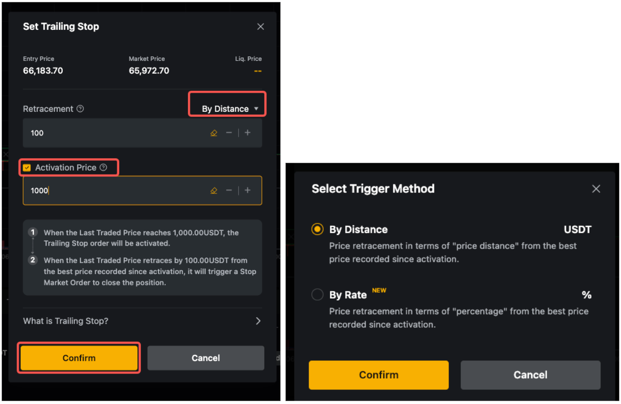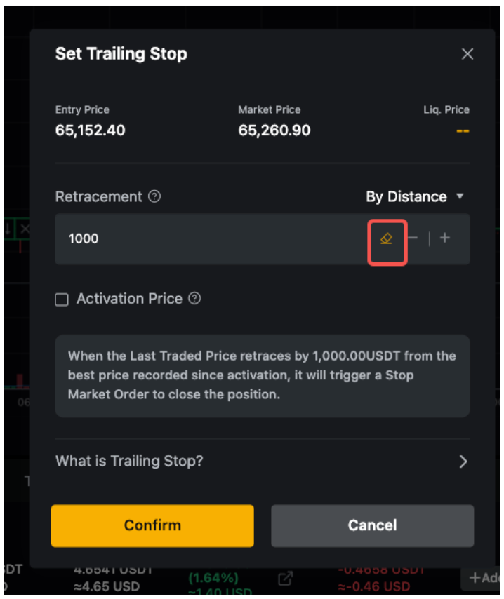 ステップ2:リトレースメントのトリガー方式(割合または距離)を選択し、必要に応じて「アクティベーション価格」を設定します。次に、「確定」をクリックします。