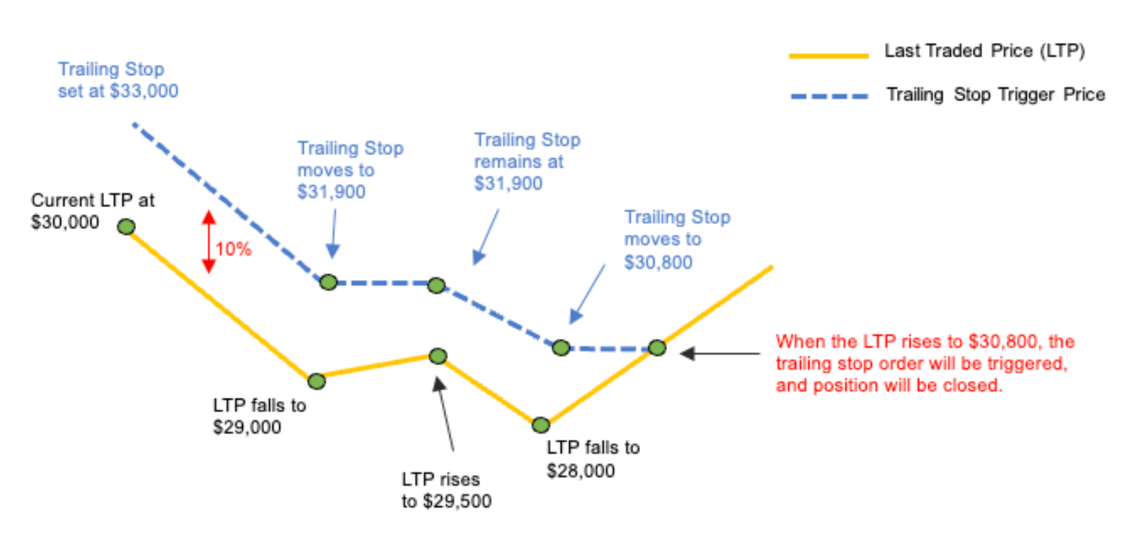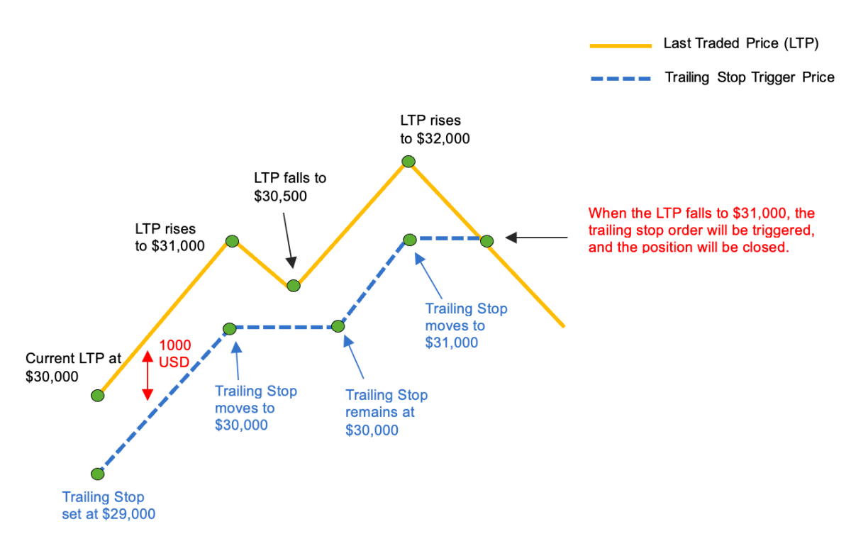 最終取引価格が30,500ドルに下落した場合、トレーリングストップは30,000のまま変わりません。