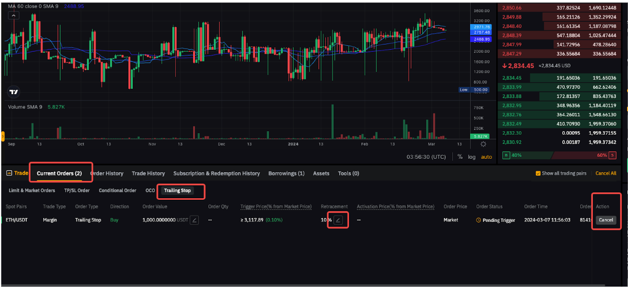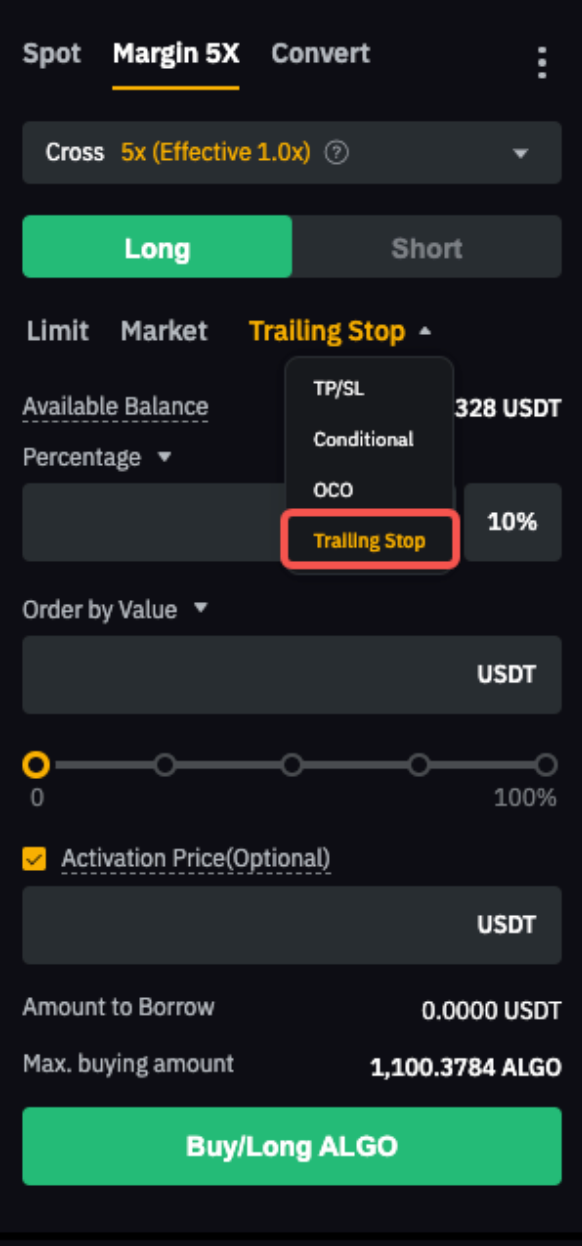 ステップ1:現物取引のページを開き、「トレーリングストップ」注文を選択します。