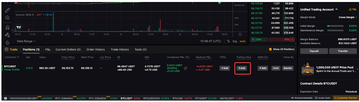 ステップ1:無期限取引と先物取引のページでお客様が建てたポジションを探し、トレーリングストップの下にある「追加」をクリックします。