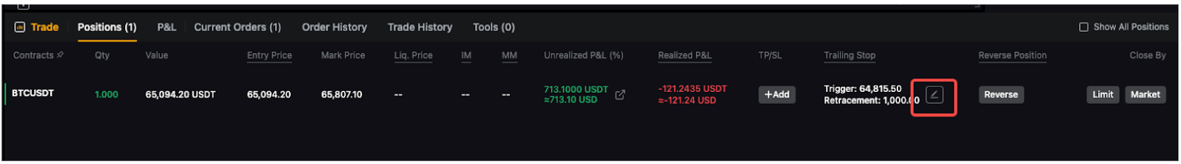 ご自身のポジションに関連するトレーリングストップの注文詳細を確認できます。注文パラメータを変更するには、トレーリングストップの横にある鉛筆のアイコンをクリックします。
