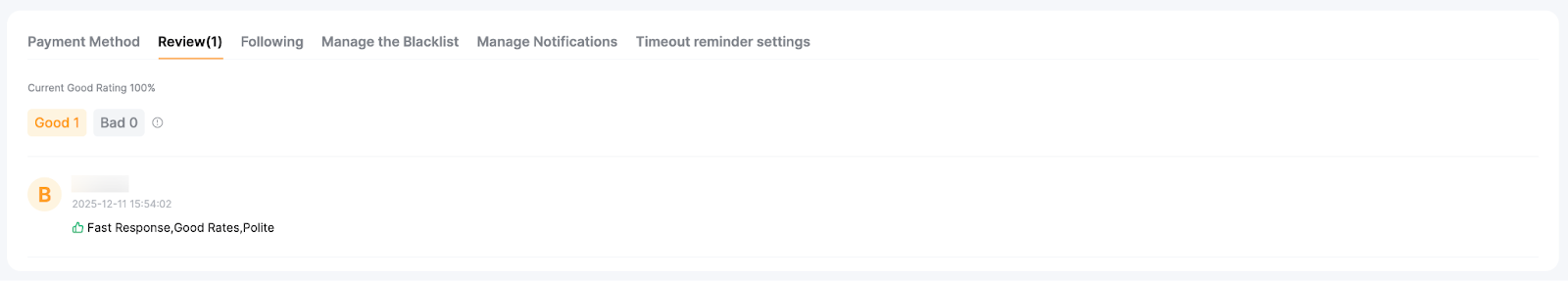 In the P2P User Center, you can view an overview of your trading performance and manage your payment methods, reviews, followings, blacklist, notifications, and timeout reminder settings.