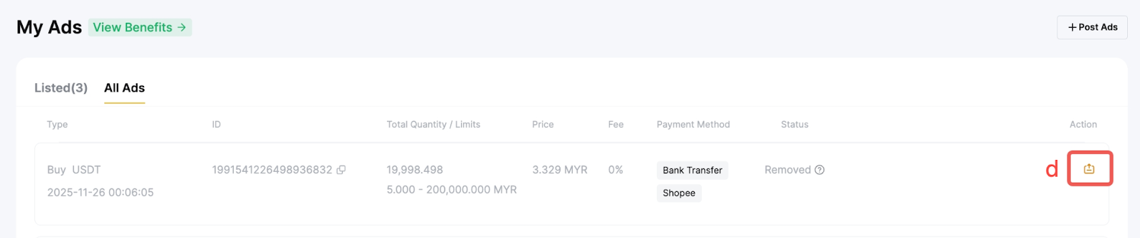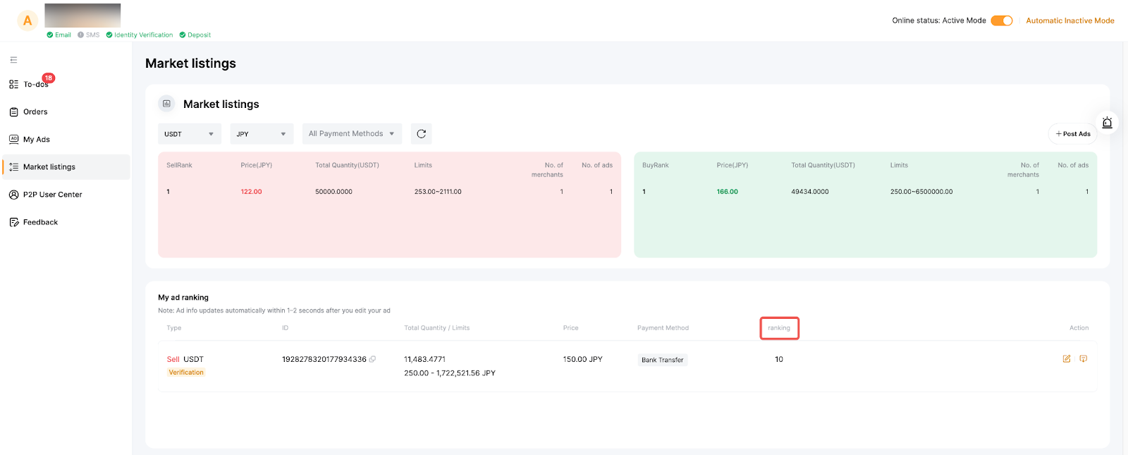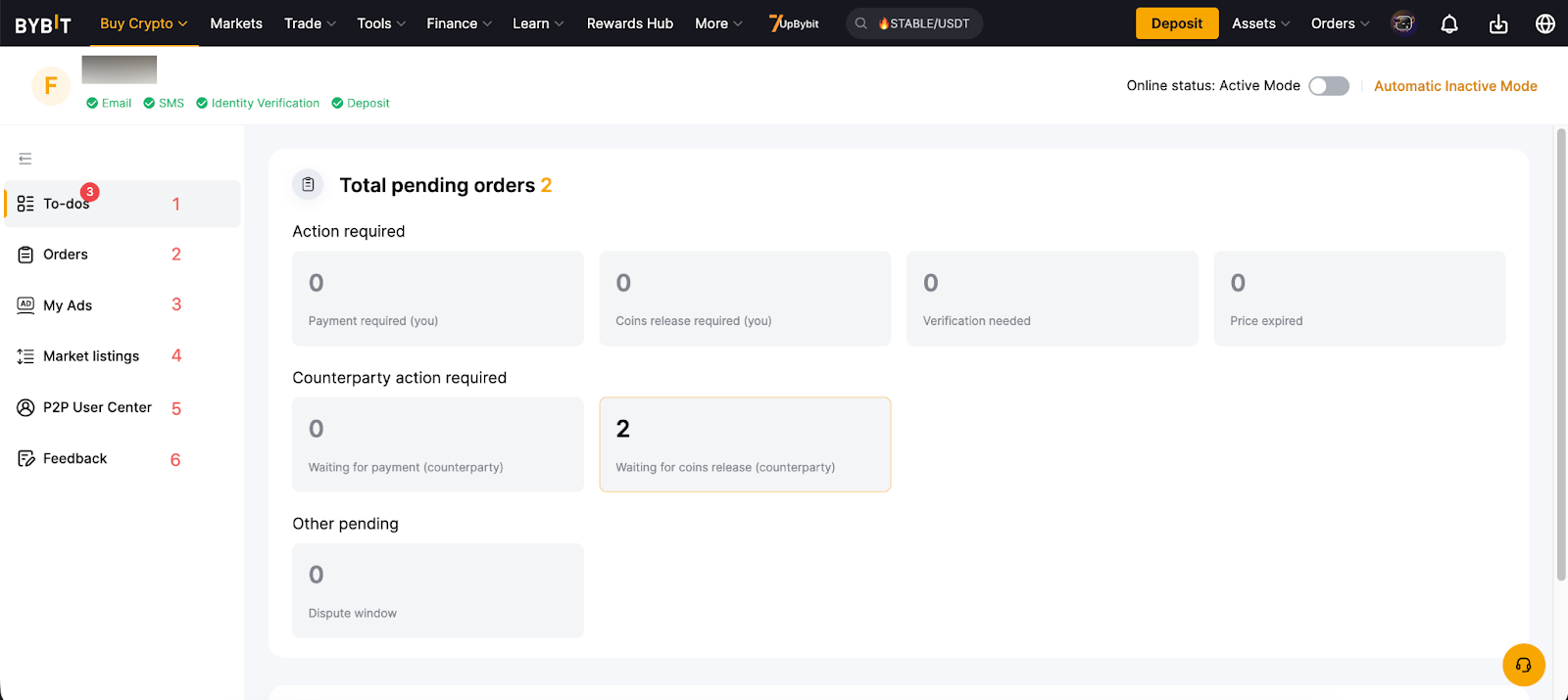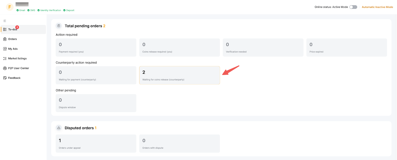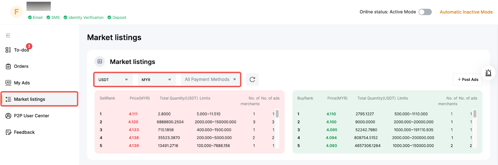 The Merchant dashboard on P2P helps you, as an advertiser, to manage your ads and orders more efficiently. It includes the list such as To-dos, Orders, Ads, Market Listings, and the P2P User Centre. However, please note that this feature is currently only available on the website.