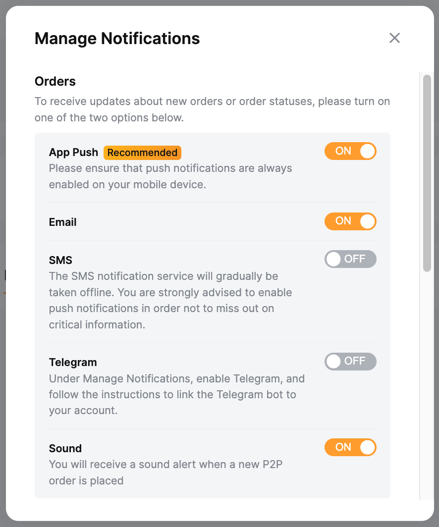 Manage your P2P notifications and alerts to receive updates on orders and appeals.