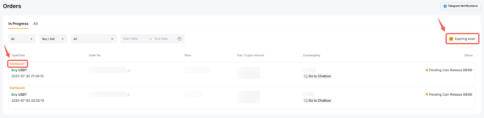 Note: Turn on Timeout Reminder Settings in the P2P User Center to filter and view your “Expiring Soon” orders. See Timeout Reminder Settings for more info.