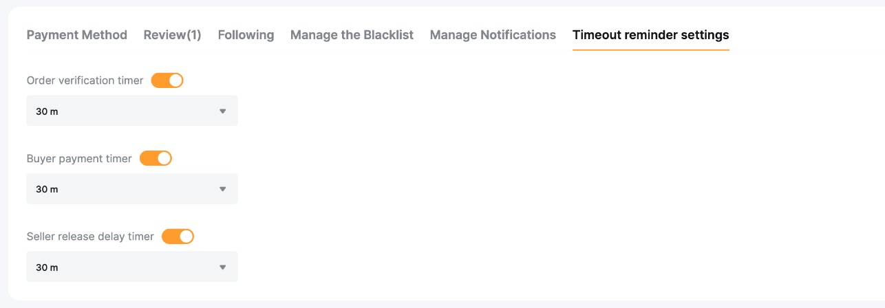 Turn on the timeout reminder to avoid delays in verification, payment, or coin release. You can set the reminder time from 5 to 30 minutes.