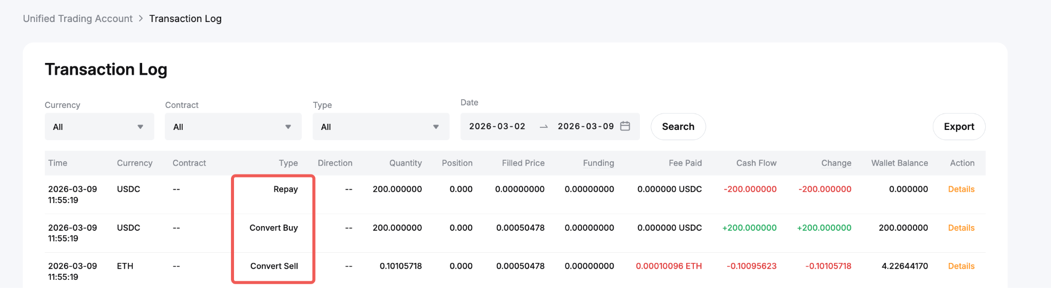 In your Transaction Log, you can find details for each repayment under the Convert and Repay transaction types—sequentially listed with identical timestamps and Order IDs. Convert transactions indicate any auto-conversions of selected collateralized assets to repay the borrowed amount. It will only appear if you have an insufficient borrowed coin in your balance for repayment, and conversions are necessary. Meanwhile, Repay transactions display the amount you have paid for your borrowed coin.