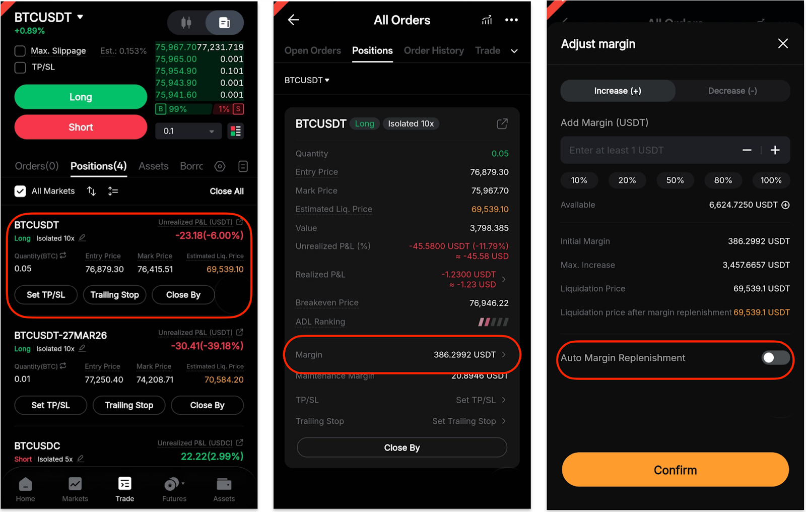 Vá para Negociar, localize sua posição na aba Posições na zona de colocação de ordens, toque na posição, depois toque em Margem, e alterne o Interruptor de Reabastecimento Automático de Margem para ativá-lo ou desativá-lo.