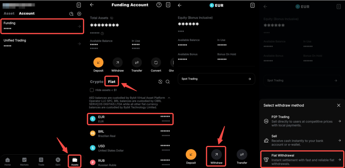 Para retirar sua moeda fiat, vá para a página de Ativos e selecione Conta de Financiamento, toque em Fiat e escolha a moeda fiat que deseja retirar, pressione Retirar → Retirada de Fiat. Os procedimentos para retirar fundos em diferentes moedas fiat são ligeiramente diferentes. Para mais detalhes, por favor visite este guia.