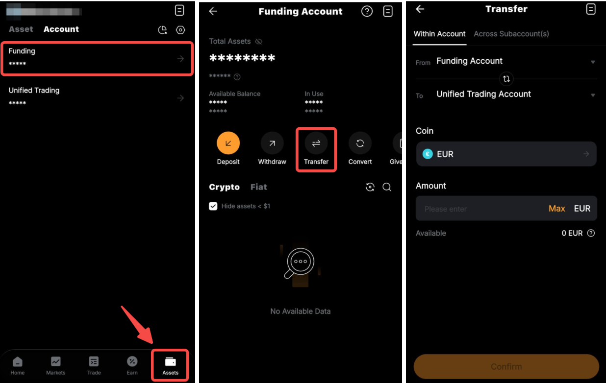 Vá para a página Ativos e selecione Conta de Financiamento. Toque em Transferir para ser redirecionado à página de transferência. Certifique-se de que as contas e a moeda fiat selecionadas estão corretas e insira o valor a ser transferido. Em seguida, clique em Confirmar.