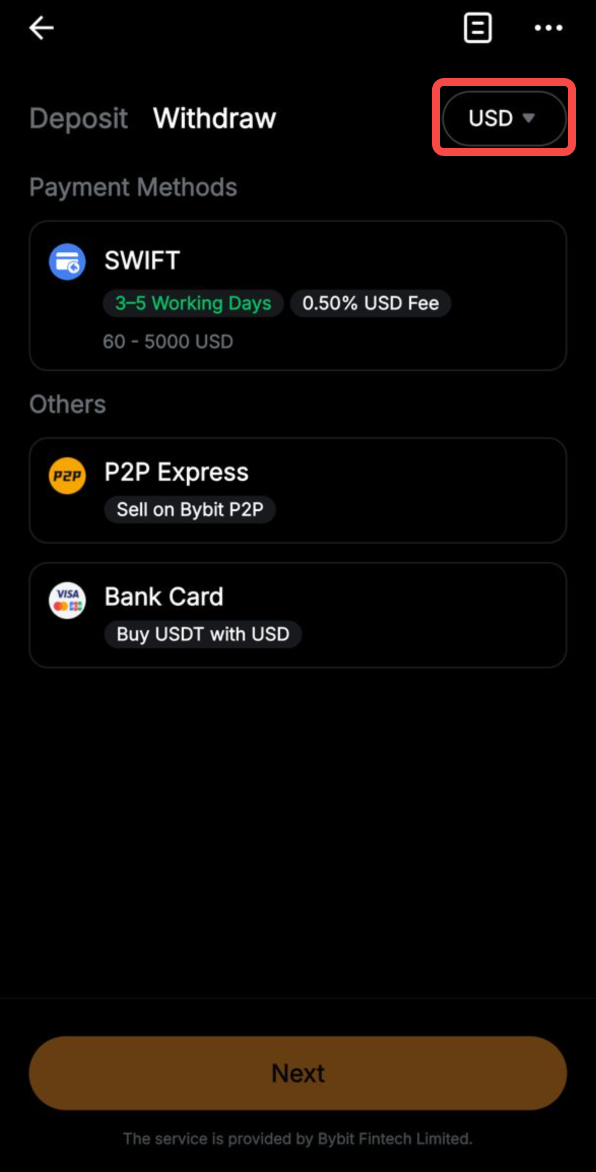 Bybit fornece uma variedade de depósitos fiat para tornar mais fácil a negociação instantânea via Saldo fiat. Os procedimentos para depósito variam de acordo com a moeda escolhida. Para mais detalhes, visite aqui.