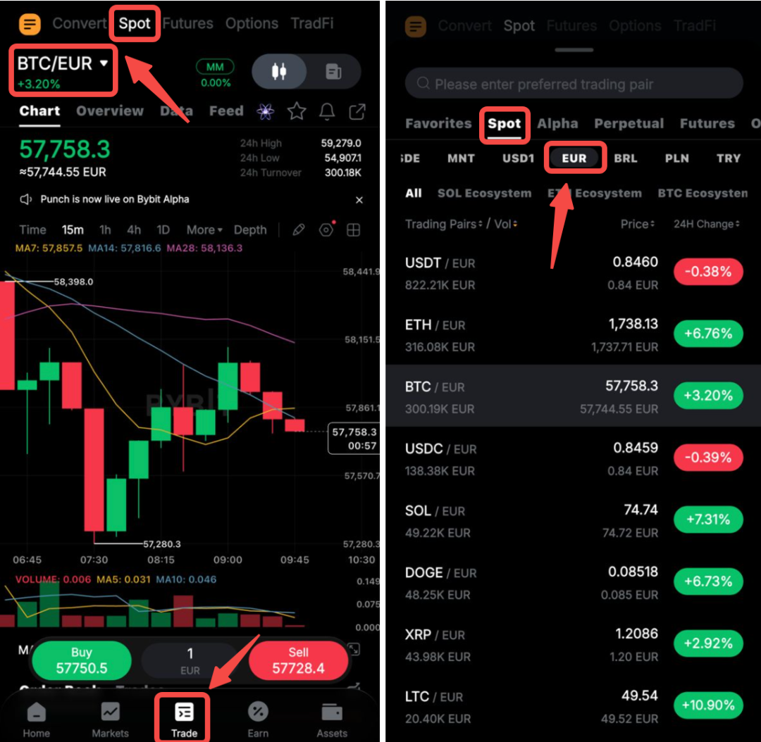Clique em Trade → Trading em Spot na barra de navegação e selecione o respectivo fiat para iniciar sua transação.