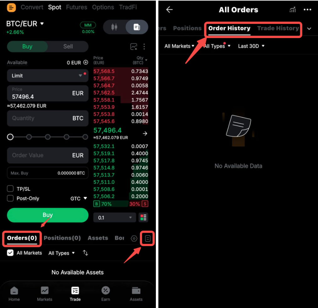 Para ver os detalhes da sua ordem ou histórico de ordens, verifique as Ordens atuais, Ordens anteriores ou Histórico de trades na área de posições.