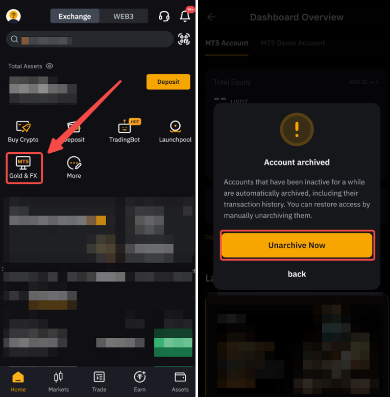 Vá para sua página de ativos MT5 da Bybit. Uma mensagem pop-up informando que sua conta foi arquivada será exibida. Para desarquivar a conta, clique no botão Desarquivar agora.