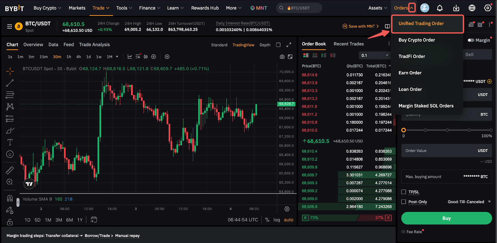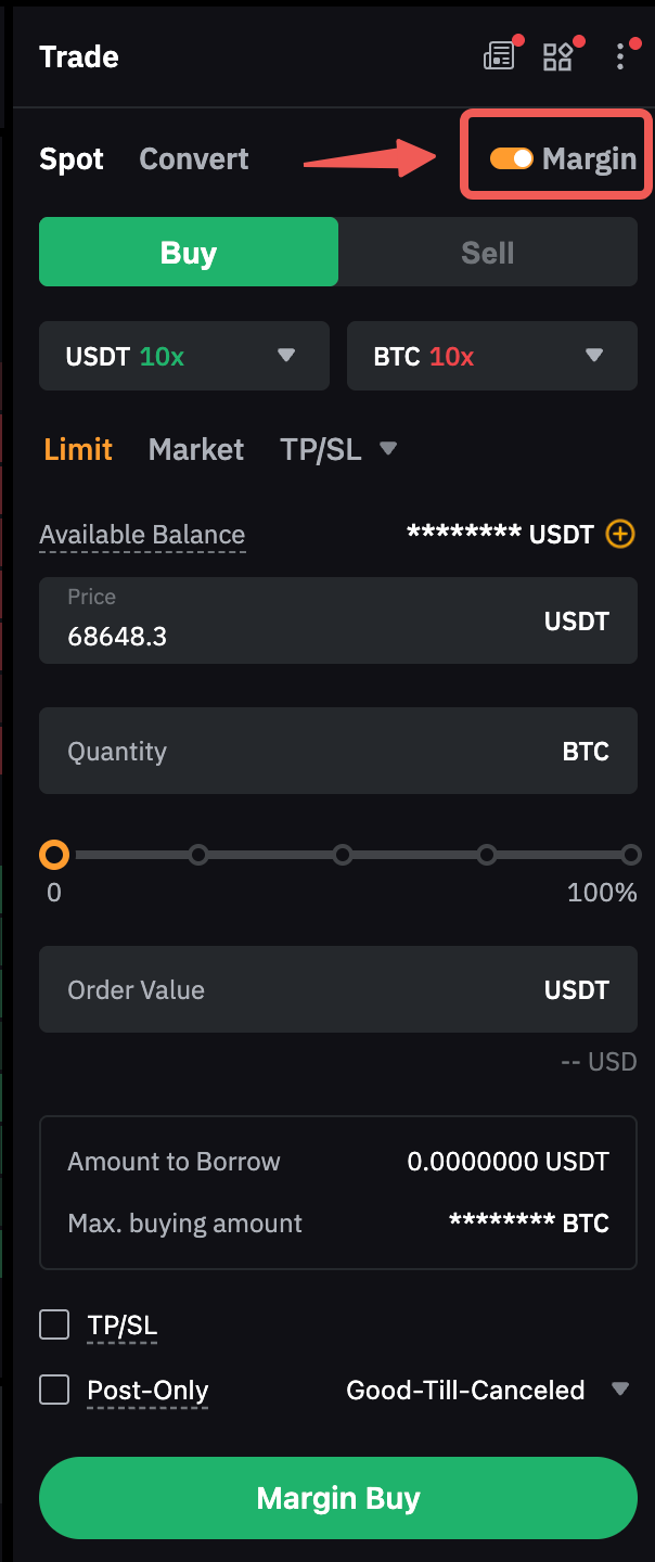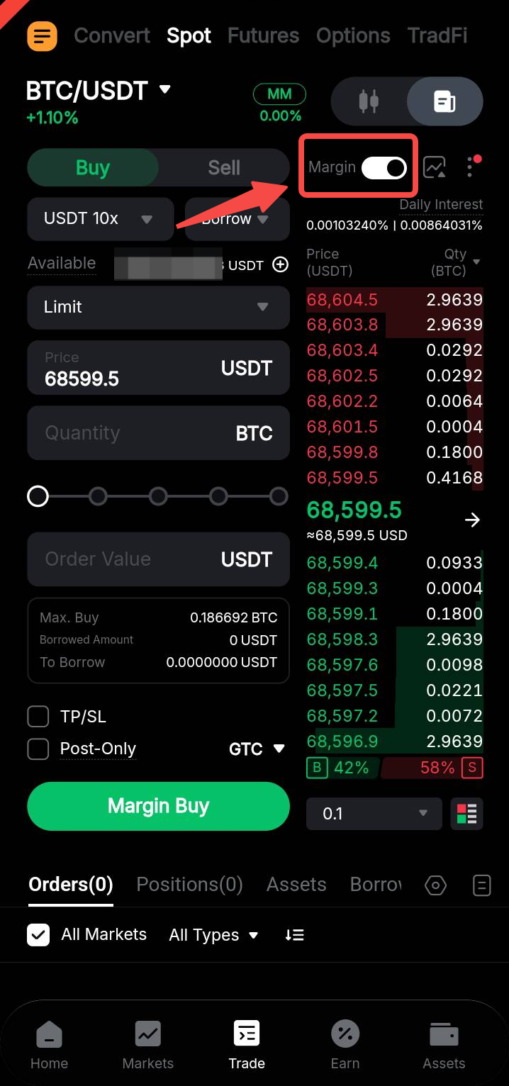 Так, позичати кошти для торгівлі на спотовому ринку можливо за допомогою функції спотової маржинальної торгівлі в режимі крос-маржі або портфельної маржі. Ви можете активувати це , перемкнувши кнопку «Маржа» в зоні ордера.