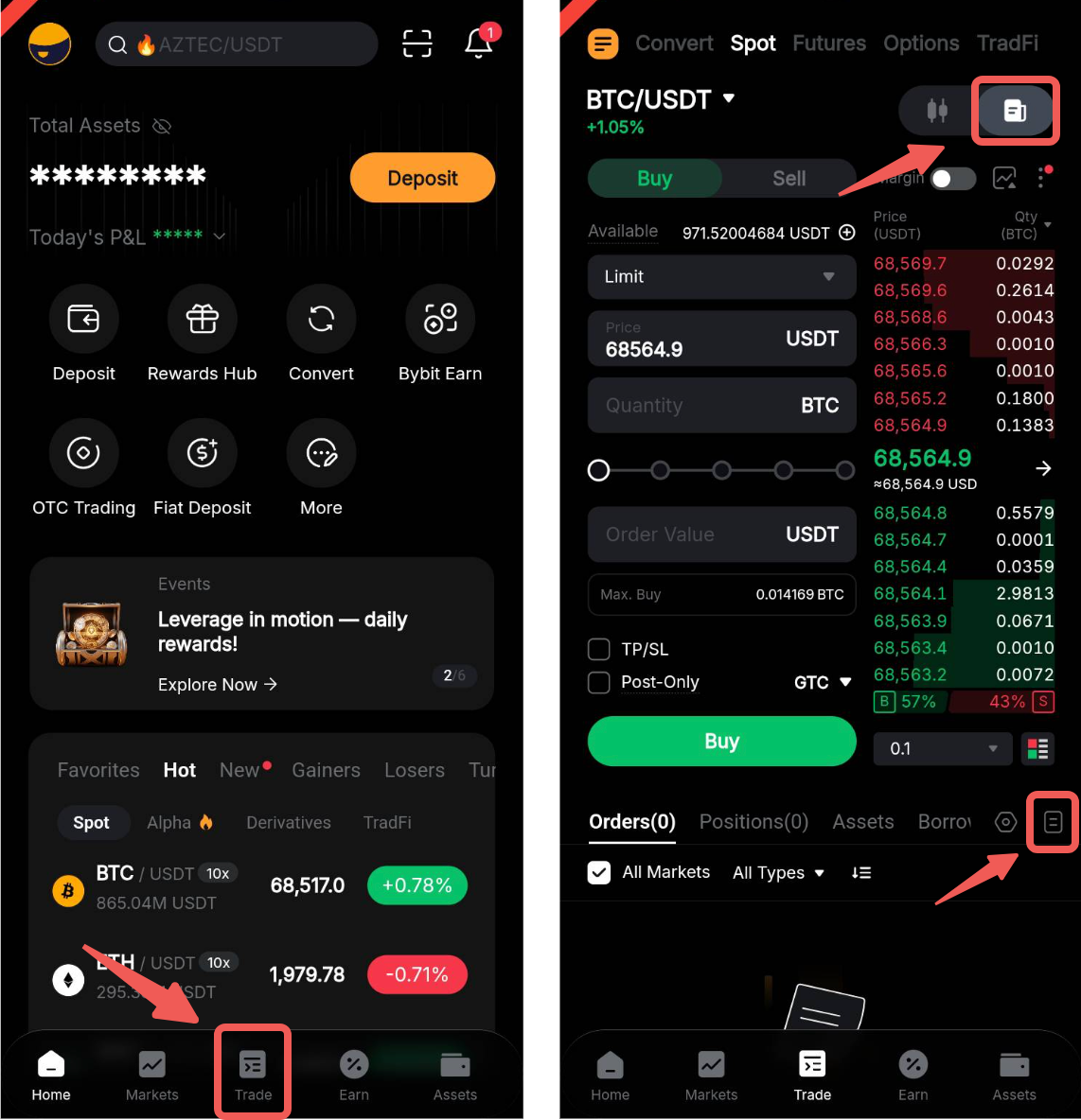 У застосунку Bybit перейдіть у розділ ТоргівляСпот і перемкніть кнопку Торгівля, щоб отримати доступ до Зони ордерів. Натисніть на значок Історія ордерів у верхньому правому куті вкладки «Позиція», щоб переглянути історію ордерів та історію угод.