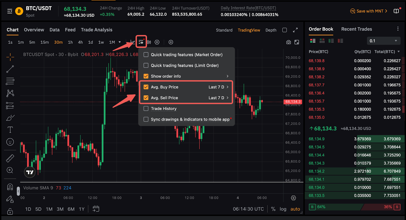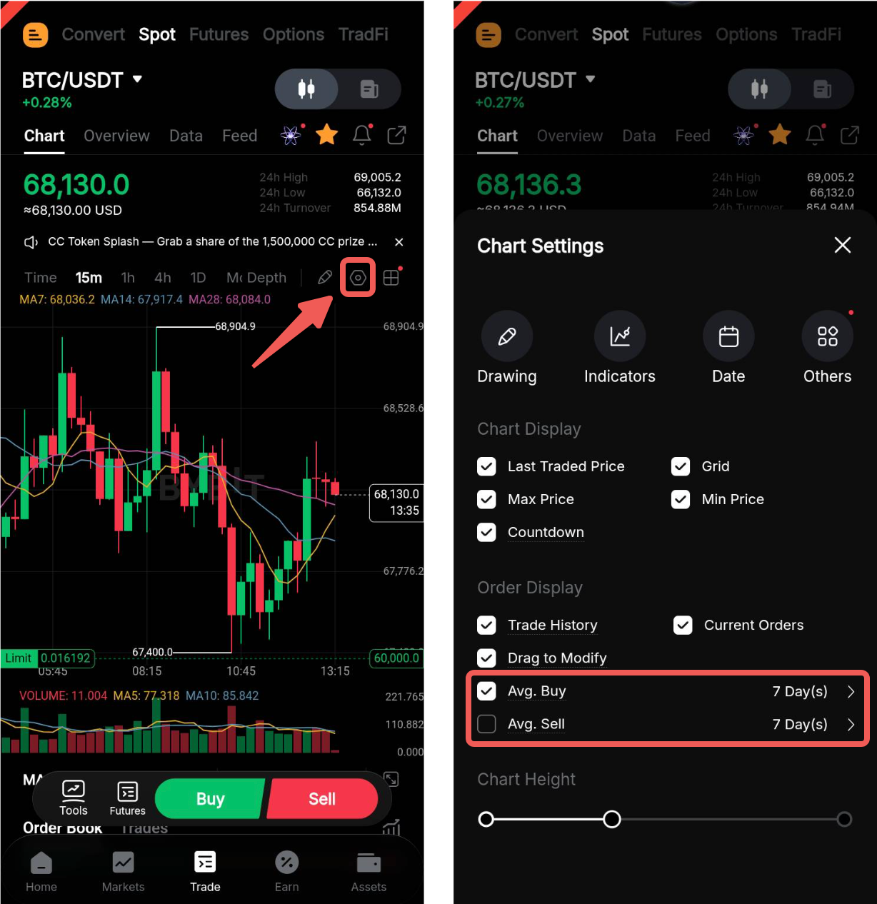 Торгуючи на споті, ви можете побачити середню ціну своїх ордерів на продаж та купівлю прямо на торговому графіку. Щоб активувати цю функцію, натисніть на піктограму «Відображення» та позначте середню ціну, яку ви бажаєте бачити. Ви також можете вибрати період, за який розраховуватиметься середнє значення (останні 7, 30, 60 або 90 днів). Зверніть увагу, що середня ціна буде розраховуватися з поточного дня до останнього дня обраного періоду.