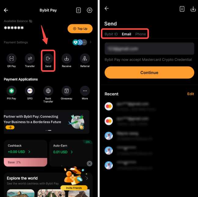 Крок 1: На сторінці Bybit Pay натисніть «Надіслати» та виберіть спосіб надсилання: за Bybit ID, електронною поштою або номером телефону.