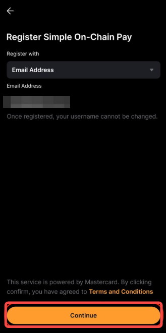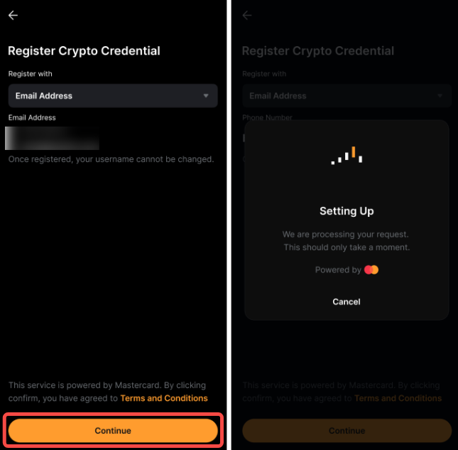 Крок 3: Виберіть адресу електронної пошти або мобільний номер, а потім натисніть Продовжити, щоб зберегти його як Mastercard Crypto Credential.