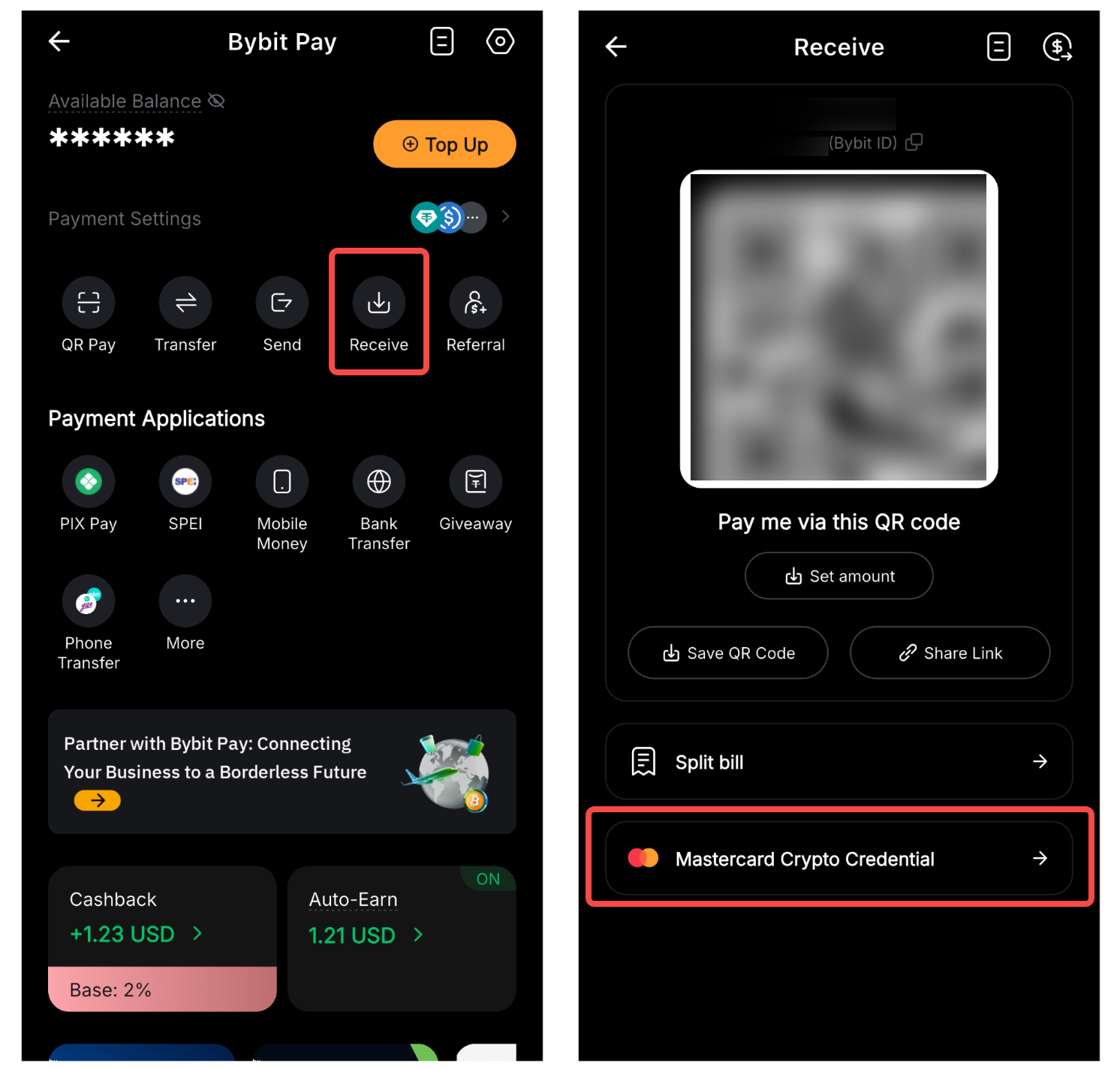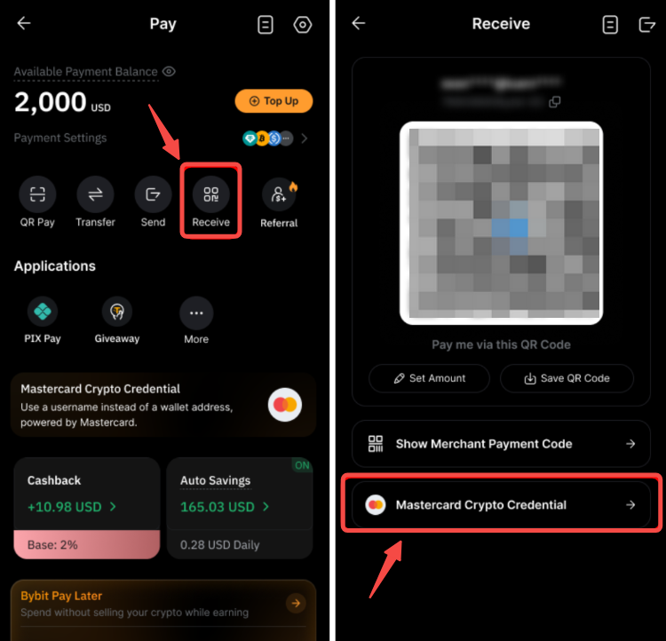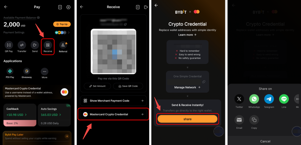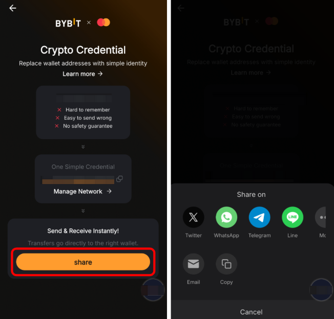 Натисніть Отримати на сторінці Bybit Pay, а потім натисніть Mastercard Crypto Credential. Натисніть Поділитися , щоб поділитися запитом на отримання у своїх соціальних мережах або надіслати його відправнику як посилання.