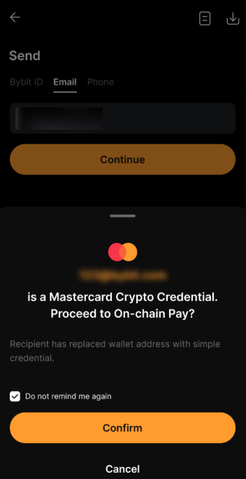 - Якщо ваш одержувач є користувачем Bybit, активи будуть надіслані лише через внутрішній переказ, незалежно від того, чи є у нього акаунт Mastercard Crypto Credential.