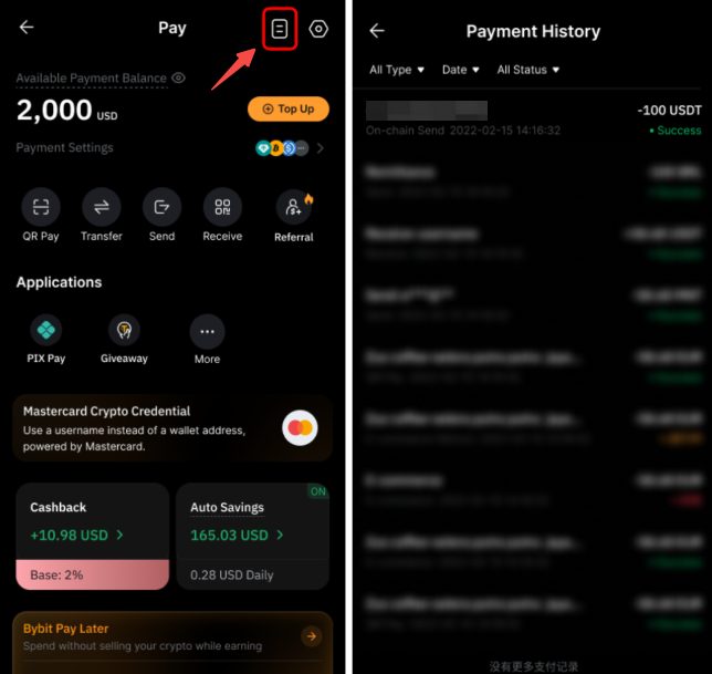 Перейдіть на сторінку Bybit Pay і натисніть значок Історія платежів у верхньому правому куті.