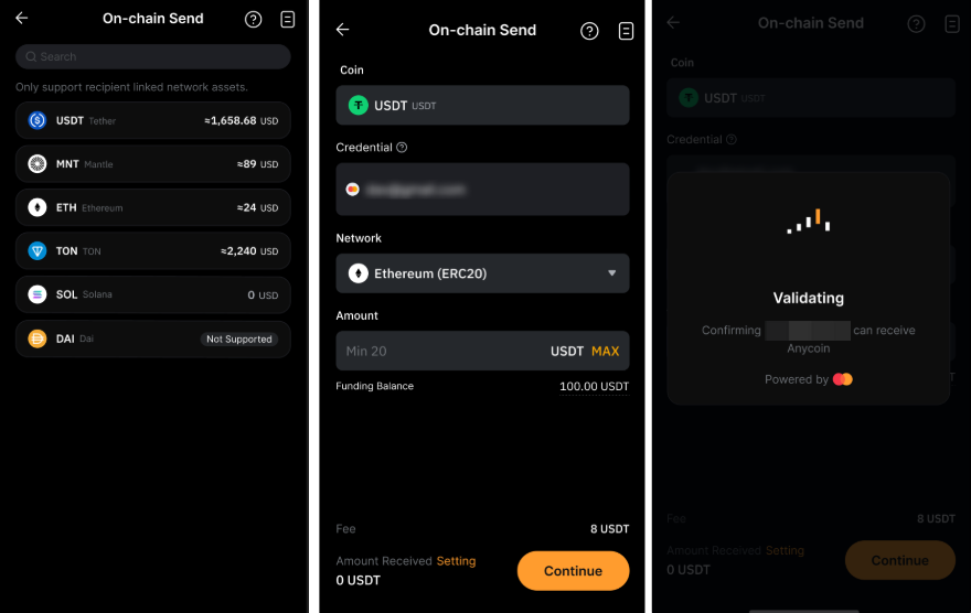 Крок 4: Виберіть криптовалюту, підтвердьте мережу та введіть суму, яку бажаєте надіслати, а потім натисніть Продовжити.