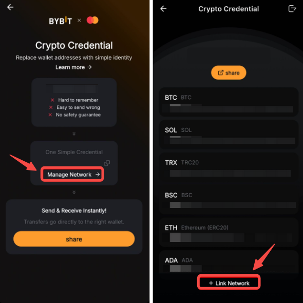 Mastercard Crypto Credential — це сервіс, який замінює довгі та складні адреси гаманців на прості, зручні для читання псевдоніми (імена користувачів). Це допомагає користувачам легше та безпечніше надсилати й отримувати криптовалюту. Наразі ця функція доступна лише в застосунку Bybit.