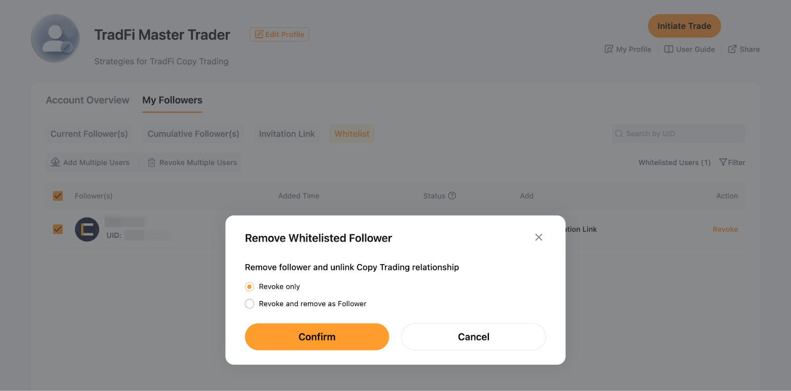 - Лише скасувати: Видаляє користувача з вашого білого списку, дозволяючи йому продовжувати копіювати наявні угоди, доки він не відпишеться. Щойно він відпишеться, він більше не зможе підписатися на вас, якщо його не буде повторно додано до білого списку.