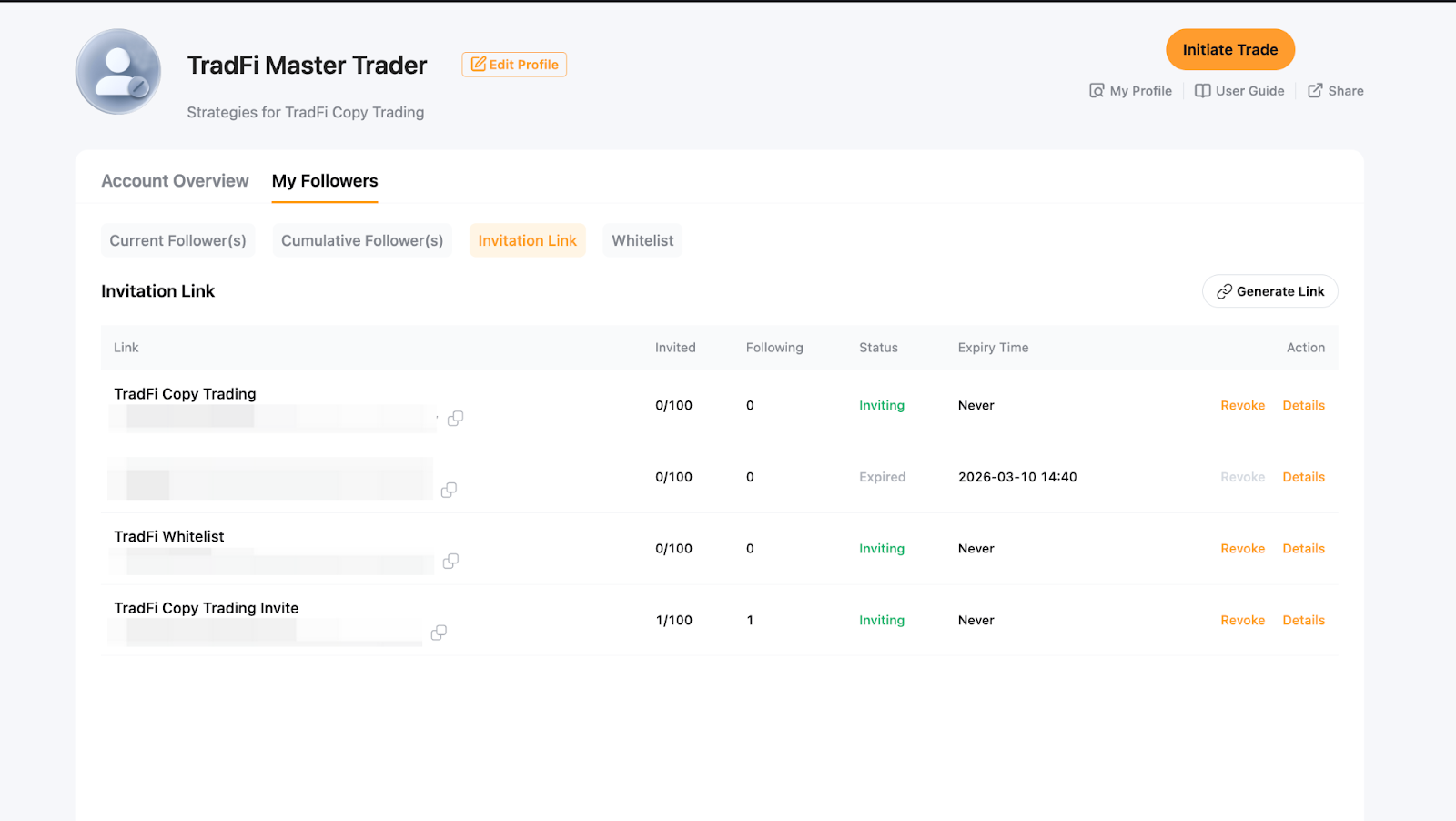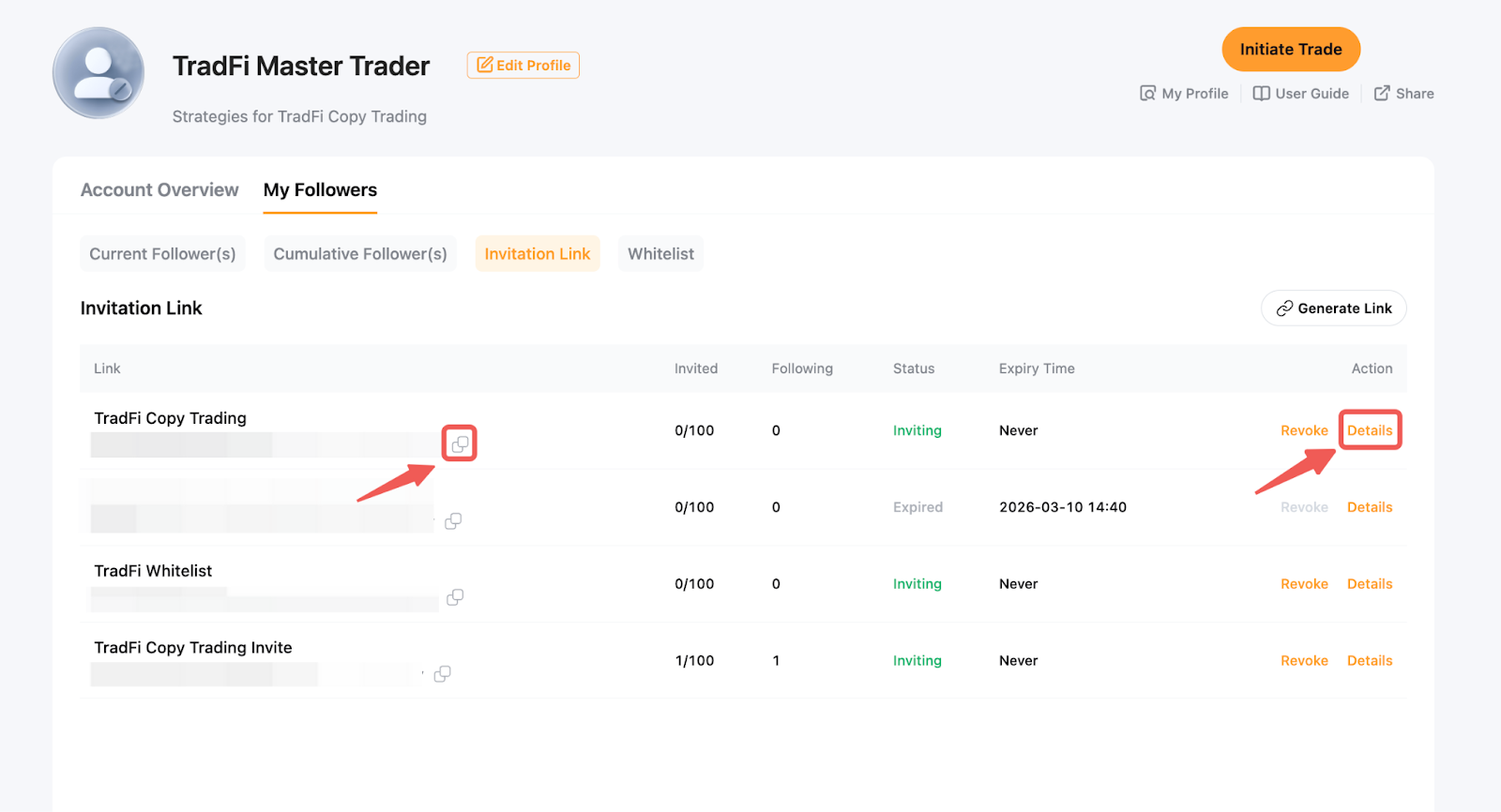 Як майстер-трейдер, ви можете згенерувати унікальне запрошувальне посилання, яке дасть змогу підписникам копіювати ваші угоди безпосередньо без додаткового підтвердження. Якщо білий список підписників увімкнено, підписники, які приєднаються за запрошувальним посиланням, будуть автоматично додані до білого списку.